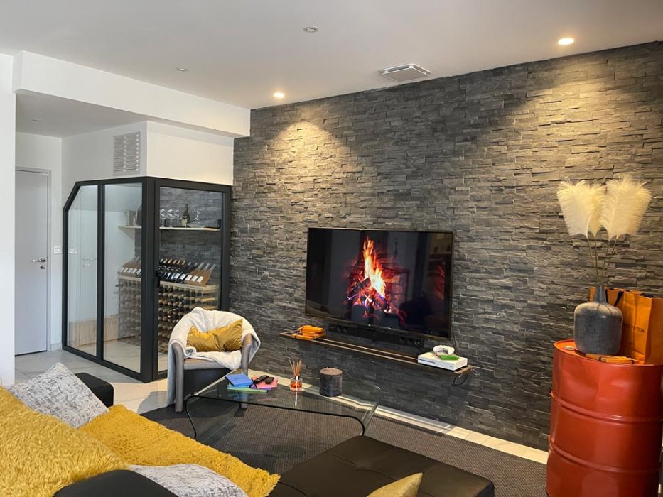 Un coin bureau ,un beau salon avec un grand écran plat et une vision sur une belle cave à vin et un mur en pierre qui donnent du cachet à la pièce. Une chambre principale avec verrière qui donne vue sur le coin bureau et disposant d’un grand écran plat. Une seconde chambre avec télévision et fenêtre donnant sur une ruelle typique de Collioure.